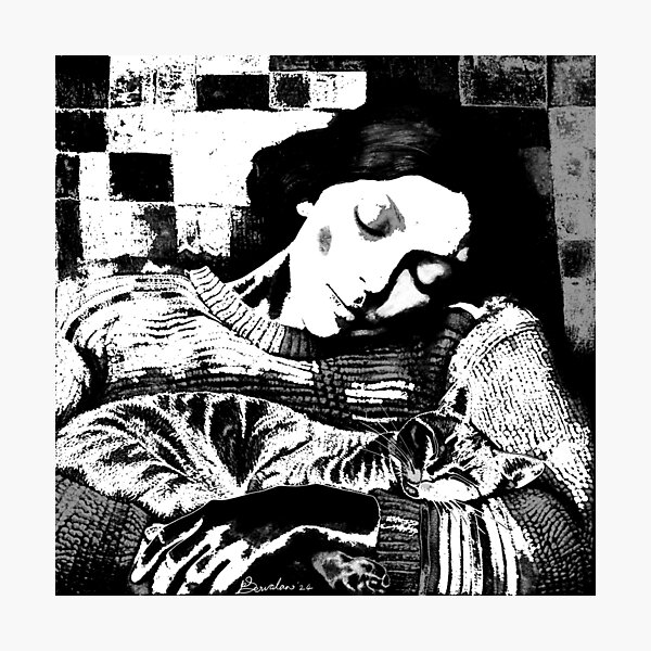 Me and Cat Sleeping in Winter Monochrome Art by iServalan for Tale Teller Club Photographic Print